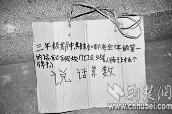 在桌子上,記者看到一塊黃色紙牌,上面寫著:“三年級(jí)期中、期末如果不考全年級(jí)第一的話,就到學(xué)校門口去站著。”(如圖)。