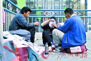 來自黑龍江的老頭其實不到50歲,雙手有殘疾。他和來自甘肅的小軍已經(jīng)“搭檔”了一年多,關(guān)系最好。聽老頭說,還在北京時,小軍當(dāng)保安,他燒鍋爐,兩人就冒充過便衣警察和嫖客,到酒吧里抓小姐,“弄”到了好幾個包。后來活做膩了,兩人開始流浪,結(jié)伴南下。從北京到廣州,一路風(fēng)餐露宿,足足走了半年才到。最后選定了人民北天橋這個據(jù)點。
