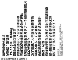 蘇小姐在南京棲霞區(qū)新港開發(fā)區(qū)一家公司做文職工作,25歲的她長期和電腦打交道,每天伏案上網(wǎng)最少十小時以上。近段時間,常常自述頭暈、目眩,肩頸部每天酸痛得很,右手有時拿著物品都會不自覺地掉落下來。去醫(yī)院檢查,被告知是頸椎長了骨刺并有韌帶鈣化,屬于頸椎病,需做綜合治療。前幾天,蘇小姐在網(wǎng)上看到一篇自翊為“山寨版治療頸椎病”的帖子,文字左右顛倒,需要上下左右不停地搖頭晃腦才能看清網(wǎng)上帖子的全部內(nèi)容,從而起到治療頸椎病的作用。