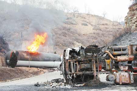 在現場記者看到,這輛油罐車車體已經分離,傾倒在公路一邊的油罐仍在燃燒,濃煙有10米多高.兩邊山上被閃爆引燃的山火已經被控制.公路右側山上一戶村民家存放的2萬多公斤玉米全部被引燃.