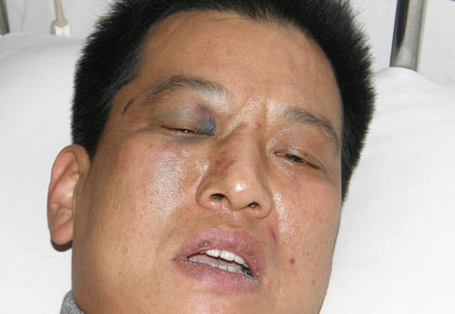 據(jù)他回憶說(shuō),12月15日下午,我在杜康花園小區(qū)尚要武家等車(chē)去灌液化氣,大約4點(diǎn)鐘左右,一伙不明身份的人(后獲悉是該縣刑警)闖進(jìn)家中,一人摟著我脖子用手槍指著我頭不讓動(dòng),將我摔在地上,另一人將我皮帶抽掉,又把鞋子脫掉,對(duì)我搜身,將電話拿走,我說(shuō)我沒(méi)辦違法事,控制我的人用手槍在我頭上砸了兩下說(shuō):“不準(zhǔn)說(shuō)話,不許動(dòng)!贝巳擞孟ドw頂著我脖子,我呼吸困難,我說(shuō)我出不來(lái)氣,掙扎了一下,此人用槍在我頭上砸了一下,又有一人在我胸口跺了兩腳,走到我左側(cè)朝我面部、頭上猛跺,隨后將我背銬手銬塞上車(chē)(非警車(chē))。