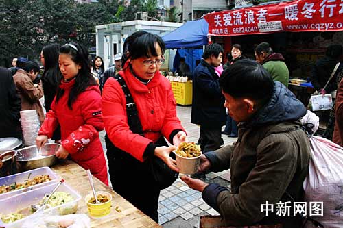 元旦期間,從四川南充到重慶打工的農(nóng)民工張世文和他的妻子楊伊婧,在重慶市臨江門一公交車站旁組織設(shè)立了一個求助點向流浪漢免費施粥。而此前,為把施粥的消息公布出去,張世文請其朋友到網(wǎng)絡(luò)上四處發(fā)帖,希望媒體采訪報道,引起社會關(guān)注。據(jù)了解,張世文是重慶市社區(qū)志愿者總隊負責人,楊伊婧也是其中一員。