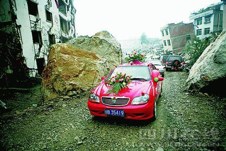 眼見一對貼著大紅喜字的結(jié)婚車隊擦肩而過,敏銳的遲阿娟跳下車拿著鏡頭緊追,“我以最快速度緊追行駛的迎親車隊,差點跑斷腸子……”未能打聽到進一步信息,遲阿娟很遺憾:“他們說新人不能下轎,車子不能停留,新人不愿說出名字,更不愿留下電話,只是說:我們是北川人,地震雖然奪走了親人、財產(chǎn),但是,生活還是要繼續(xù)!”