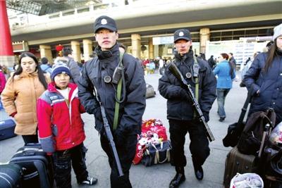 昨天,持槍特警在北京西站巡邏。當(dāng)天,記者從北京鐵路警方獲悉,為確保春運期間旅客的安全,目前,鐵路警方已安排30名特警進(jìn)駐北京站和西站,負(fù)責(zé)在站前廣場24小時持槍巡邏。(本報記者 王儉 王鵬昊 攝影報道)