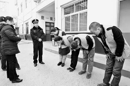 4個(gè)騙子昨日站在辛家廟派出所的院子里,面對(duì)受害人大梅悲憤的責(zé)問(wèn),一起給大梅深深地鞠躬表示道歉。
