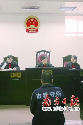 由于關(guān)押疑犯的廣州市第三看守所距離海珠區(qū)法院較遠(yuǎn),運(yùn)送疑犯的警車10時(shí)許才到達(dá)法院,原定于9時(shí)30分開庭的此案于10時(shí)11分正式開庭。疑犯黃新在進(jìn)入審判庭之時(shí),露出短暫的笑容。