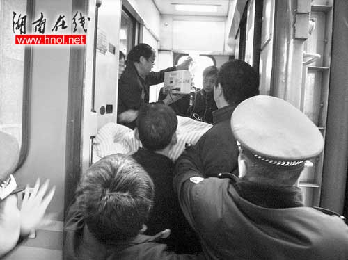 昨日下午4時(shí)40分,株洲火車站原定?慷九_(tái)的廣州開(kāi)往成都的K193次列車緩緩駛進(jìn)一站臺(tái)。站臺(tái)上,從一輛早已等候在此的救護(hù)車上,醫(yī)生、民警和患者家屬合力抬下一副擔(dān)架登上列車。擔(dān)架上躺著一名戴著呼吸機(jī)、處于重度昏迷的患者。