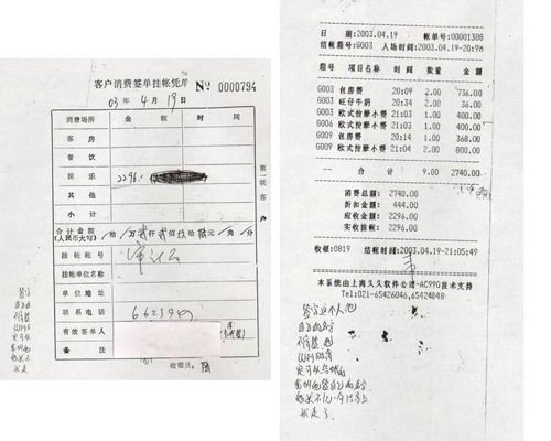 結(jié)賬小票上列明的服務(wù)包括貴賓包房費(fèi)、鐘費(fèi)、加鐘、小費(fèi)、飲料等。第一次消費(fèi)的時(shí)間為2003年4月19日,入場(chǎng)時(shí)間為晚8點(diǎn)09分,結(jié)賬時(shí)間為晚9點(diǎn)05分。總消費(fèi)金額為2296元。其中,包房共計(jì)3間,費(fèi)用為1104元(368×3);歐式按摩小費(fèi)共有3筆,其中兩筆分別為400元,另一筆則標(biāo)明數(shù)量為2,金額為800元。另一份賬單的時(shí)間為2003年9月27日,入場(chǎng)時(shí)間為晚上8點(diǎn)03分,結(jié)賬時(shí)間為晚9點(diǎn)10分?傁M(fèi)金額為1498元。其中“貴賓包房費(fèi)”是498元,鐘費(fèi)是200元,加鐘是200元,小費(fèi)是600元。