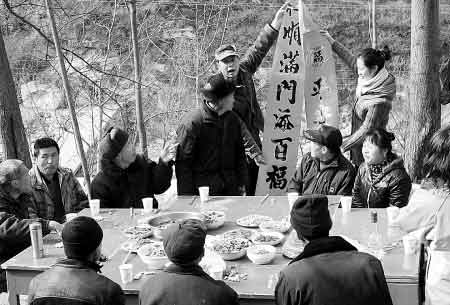 這一桌豐盛的酒菜,是常年在長安區(qū)大峪口龍石溝利用業(yè)余時(shí)間義務(wù)植樹造林的郭建民一家精心準(zhǔn)備的,專門宴請龍石溝的15戶村民一同提前吃年夜飯。