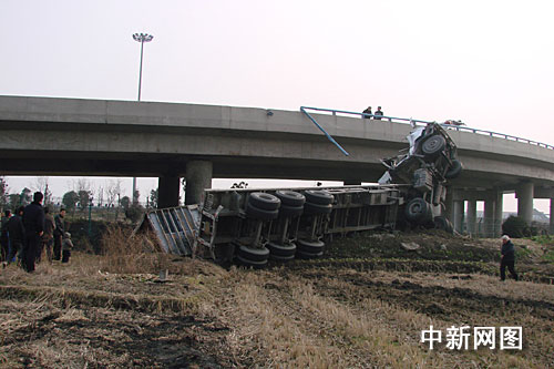中新網(wǎng)湖州1月23日電(記者袁爽 通訊員汪焱)近日,一輛重型集裝箱半掛車(chē)在途經(jīng)申蘇浙皖高速公路皖向織里下主線匝道處時(shí),不僅超速行駛,更是嚴(yán)重超載超限,結(jié)果該車(chē)在高速路上玩起了“變形金剛”,釀成慘劇。據(jù)了解,出事車(chē)輛碰撞右側(cè)護(hù)欄后翻下落差7米的橋梁。記者俯瞰現(xiàn)場(chǎng),該車(chē)就像是美國(guó)大片《變形金剛》里躺下的擎天柱,所幸車(chē)上人員受傷較輕,無(wú)生命危險(xiǎn)。