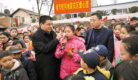 昨日下午,陳光標(biāo)率領(lǐng)由全國(guó)63位企業(yè)家組成的“春節(jié)慰問地震災(zāi)區(qū)愛心團(tuán)”,來到德陽市中江縣龍臺(tái)鎮(zhèn),在龍臺(tái)中學(xué)和蘭渡小學(xué)開展慰問活動(dòng)。