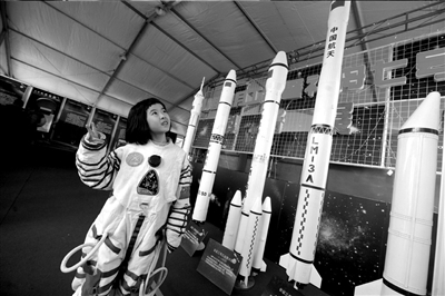 當(dāng)天下午,設(shè)在騰龍閣的航天科技體驗場不斷有三五成群的游人進(jìn)出,神七返回艙的全尺寸模型、嫦娥一號的實物火箭殘骸、剛剛研制出來的長征五號運(yùn)載火箭的微縮模型……站在只有在電視上能見得到的航空物品前,小朋友拉著爸爸媽媽問個不停。旁邊,等待試穿宇航服的游客自發(fā)排起隊,準(zhǔn)備過把“航天癮”!吧駳獍,快給我拍一張。”湖南來京務(wù)工人員張淼第一次逛廟會,穿好宇航服后,他立即站到太空照片的背景前拍照留念。