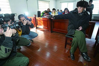 檢察官宣讀起訴書時(shí),周老漢得到照顧,一直坐在椅子上聽。