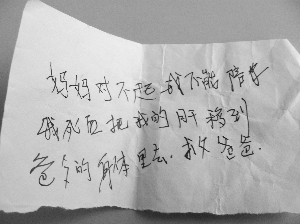 令崔女士怎么也沒有想到是,1月24日中午12點(diǎn)半左右,當(dāng)她從醫(yī)院回到家,卻發(fā)現(xiàn)自家的大門被反鎖了,“我只好從后院翻墻進(jìn)去,看到我女兒躺在床上一動(dòng)不動(dòng),就像死了,旁邊有兩個(gè)安眠藥空瓶和一張遺書,上面寫著‘媽媽對(duì)不起,我不能陪你,我死后把我的肝移到爸爸的身體里去,救爸爸。’”崔女士頓時(shí)覺得天旋地轉(zhuǎn),“這兩瓶安眠藥有200粒!女兒是23日傍晚五點(diǎn)多在醫(yī)院吃過晚飯回家的,到我發(fā)現(xiàn)的時(shí)候,有十多個(gè)小時(shí)了!