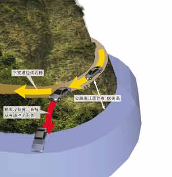 冉某說,出事的地方位于忠縣縣城2公里處,是一條村級土路的長下坡,下完坡后本應該右轉(zhuǎn),但轎車沒有轉(zhuǎn)彎,而是直接從彎道沖了下去!肮冯x江面約有100米高,打撈出來的轎車車門是打開的!比侥痴f,由于轎車墜江的地方是懸崖,兩人應該先是跳出轎車,最終男子掉進了江里,而其侄女則滾到了江邊。