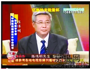 在一家電視臺(tái)播出的億康納米能量杯廣告中,一位學(xué)者打扮的人端坐當(dāng)中,文字顯示,“專家”名叫陳偉明,是中國(guó)醫(yī)促健康飲水協(xié)會(huì)理事。而在另一幅華佗延壽酒的廣告視頻截圖中,容貌一樣,甚至連領(lǐng)帶圖案都一樣的“陳偉明”,“搖身一變”卻成了“關(guān)新良”,身份也變成《北京中醫(yī)》雜志編委、中國(guó)中西醫(yī)結(jié)合協(xié)會(huì)理事、北京中日友好醫(yī)院主任醫(yī)師。