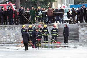 事發(fā)現(xiàn)場,吞噬了年輕男子的冰窟緊靠敬業(yè)湖南岸。公安、消防人員將敬業(yè)湖緊鄰北洋道一側(cè)的湖岸封鎖,7個民警沿著親水平臺走上冰面,用竹竿在冰下摸索著。時間一分一秒地過去,救援人員找來一塊長方形木板,當(dāng)作筏子艱難地破冰搜救。一個半小時過去了,救人的“筏子”漸漸向湖心移動,搜索的竹竿在一米一米地加長,但水下沒有一點動靜。
