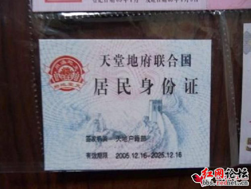 最“雷人”的是冥幣上印制的內(nèi)容!其中“天堂地府聯(lián)合國居民身份證”,發(fā)證機(jī)關(guān)是天地戶籍部,最有“創(chuàng)意”的要屬其“國徽”了,上面印有國名“天堂地府”,還有“天地通用”四個字樣。而神通廣大的“天地通用”的紙幣,發(fā)行銀行是“天地銀行有限公司”,上面的圖案是傳說中的玉皇大帝。