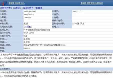 隨后,信息時(shí)報(bào)記者登上了中國(guó)專利信息中心這個(gè)國(guó)家知識(shí)產(chǎn)權(quán)局直屬單位的網(wǎng)站,根據(jù)網(wǎng)友“呂輕侯”提供的截圖和信息,在中國(guó)專利信息中心的專利數(shù)據(jù)庫(kù)檢索系統(tǒng)仲搜到了這份申請(qǐng)(專利)號(hào)為200510012992.0的申請(qǐng)公開說明書。申請(qǐng)(專利權(quán))人和發(fā)明人是一個(gè)家住河北省石家莊市,名叫王俊峰的人。提出申請(qǐng)的日期是2005年的11月21日,而該發(fā)明的全稱為“一個(gè)檢驗(yàn)是否貪官污吏的方法”。