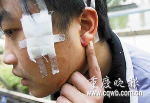 小販夜市擺攤,城管隊員去阻止,引發(fā)雙方打斗。打斗中,小販一棒擊中城管隊員腰部,而城管隊員一口咬破小販耳垂。“全武行”發(fā)生在九龍坡區(qū)黃桷坪,昨日,小販李利捂著耳朵去找對方理論。