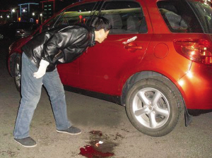 在一知情者的帶領(lǐng)下,記者找到了死者事發(fā)時乘坐的轎車。這是一輛紅色長安鈴木轎車,車的左側(cè)后座門把手上方,一個長約10厘米的大口子清晰可見,大口子已透過轎車鋼板,足見當(dāng)時進(jìn)入車內(nèi)煙花的威力之大。轎車后座的靠背上,還留有一大攤血跡。