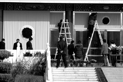 昨天,工作人員正在告別廳外進(jìn)行布置。今天上午10時,在央視大火中犧牲的張建勇烈士遺體告別儀式將在八寶山殯儀館舉行。昨天,十多名身著制服的消防官兵整齊地進(jìn)入殯儀館東禮堂內(nèi),布置送別禮堂。