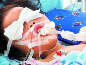 黃蓉今年6歲半,四川人。上了呼吸機的黃蓉被蒙著雙眼,躺在病床上,雖然有心跳,但對外界的刺激毫無反應(yīng)。主治醫(yī)生說,其病情危重,“已接近腦死亡”。