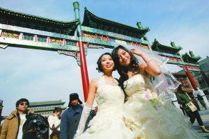 情人節(jié)的中午,兩對(duì)盛裝的同性戀情侶在前門步行街拍攝婚紗照,并和其他同性戀朋友一起向路人贈(zèng)送玫瑰。參與的同性戀情侶稱,希望通過公開拍攝同性結(jié)婚照的形式,推動(dòng)社會(huì)對(duì)同性戀群體的關(guān)注和接納。