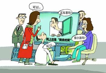 在搜索引擎百度上輸入“出售剩余時(shí)間”,可得到相關(guān)網(wǎng)頁(yè)400多萬(wàn)篇,“出售時(shí)間”生意的火爆可見(jiàn)一斑!澳阆敫墒裁次襾(lái)幫你完成,給你節(jié)約時(shí)間,用我的時(shí)間來(lái)給你辦事,然后你支付一定的費(fèi)用,這就是‘出售剩余時(shí)間’。”網(wǎng)友劉女士在廣告上如此解釋“出售剩余時(shí)間”。