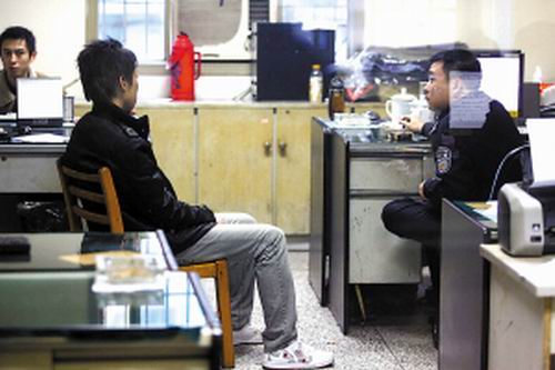 昨天下午4點(diǎn),記者在較場(chǎng)口派出所的詢問室外,隔著玻璃看到了這名小伙子。他身高大約1.65米,身穿黑色冬衣,栗黃色的頭發(fā)十分蓬亂,臉上和脖子上臟兮兮的,目光有些呆滯。