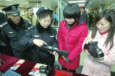在昨天的展覽上,被查獲的違禁品裝滿20個展柜,警方在王府井站一層站廳中心用實物展柜和圖片圍成一個參觀區(qū),乘客在進入站臺前便可以免費參觀。