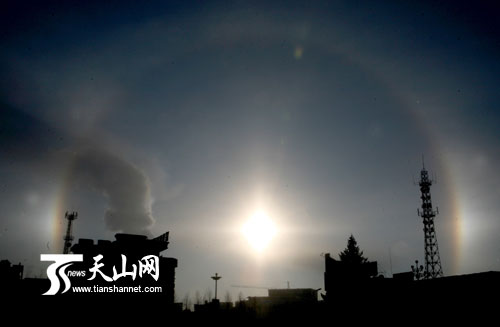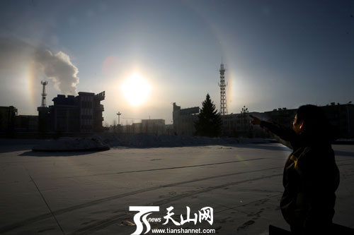 2月22日上午,在新疆富蘊(yùn)縣拍攝的“三個太陽”現(xiàn)象。當(dāng)日,富蘊(yùn)縣天氣,晴, -15 ℃ /-30℃ 。