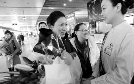 “四川汶川地震女英雄蔣敏來沈陽啦!”2月22日一早,記者聞訊趕至沈陽桃仙機場。來自沈陽大健康體檢中心的醫(yī)護人員手捧鮮花,專程迎接這名堅強的女警花。
