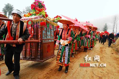 下午一點(diǎn)半,在“媒人公”的帶領(lǐng)下,迎親隊(duì)伍用花轎把新娘抬往新郎家,一百多位身著傳統(tǒng)花瑤服飾、手舉花傘的花瑤婦女隨隊(duì)伍護(hù)送新娘。今晚,新郎家將按照傳統(tǒng)風(fēng)俗繼續(xù)舉行婚禮的其他儀式。紅網(wǎng)特派報(bào)道組將全程拍攝報(bào)道這場(chǎng)“史上最原生態(tài)的花瑤婚禮”,請(qǐng)關(guān)注近期紅網(wǎng)的文字、圖片、視頻報(bào)道,分享這一難見(jiàn)的傳統(tǒng)花瑤婚禮。(記者 陳宗昊)