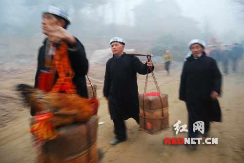 天還沒(méi)亮,新郎唐德武家的迎親隊(duì)伍便抬著花轎前往十多里外的銅錢坪村迎接新娘,和普通婚禮不同的是新郎并不在迎親隊(duì)伍中,帶隊(duì)的是花瑤婚嫁風(fēng)俗中特有的“媒人公”。在距離新娘家不遠(yuǎn)的地方擺下有辟邪含義的“五子飛棋”之后,三道攔門酒成了“媒人公”必須通過(guò)的考驗(yàn)。對(duì)歌、打蹈(新娘家的女性跳坐在媒人公膝蓋上)、打泥巴(將田里剛挑來(lái)的泥巴涂抹在“媒人公”身上),每個(gè)花瑤婚嫁元素都按照傳統(tǒng)習(xí)俗上演。一把由“媒人公”帶來(lái)、被新娘家掛上繡球的花傘是花瑤婚俗中最有特色的信物,它象征著新娘將自己的愛(ài)情隨著花傘送到新郎手中。