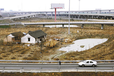 跨過一張已經被撕裂的鐵絲網,快速奔過兩條雙向六車道的高速公路和往上海方向的匝道,那呼嘯而過的車輛讓我不寒而栗。強壓住內心的恐懼,繼續(xù)翻越往杭州方向的匝道,往前三百米,又穿越高架匝道,邁過雜草叢生、凹凸不平的地面,再往里前行二百米后,隱約看見一戶被條條匝道環(huán)繞著的小屋。據村民介紹,這條“長征路”是唯一能到達王來英家的“通途”。