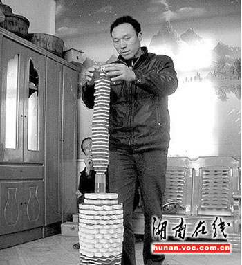 用一個(gè)麻將子頂起26副(2800多個(gè)子)麻將,凈高達(dá)到3米,你見過嗎?湘潭縣姜畬鎮(zhèn)31歲的彭樹炎經(jīng)過8年苦練,練出這樣一手絕活。他盼著能創(chuàng)造一項(xiàng)吉尼斯世界紀(jì)錄。