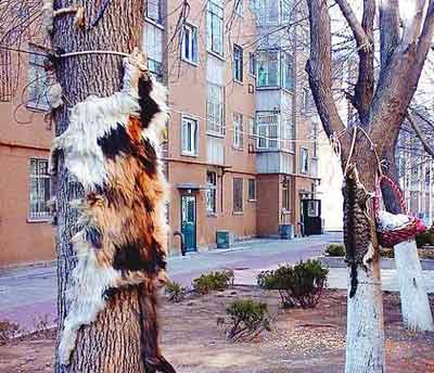 近日,在天涯、華商網(wǎng)等各大論壇都可看到這樣一個帖子——《慘無人道,殺死流浪貓吃肉后還剝皮綁在樹上》。點擊進(jìn)去可以看到,在某小區(qū)一戶人家門前的樹上,兩張貓皮一左一右被綁在那里,繩子分別從嘴部和尾部勒過。