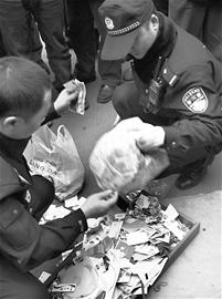 上午10時(shí)40分,警方將老人從樓上扔下的錢、名片、光盤等東西一一收拾好帶走,以作進(jìn)一步調(diào)查。