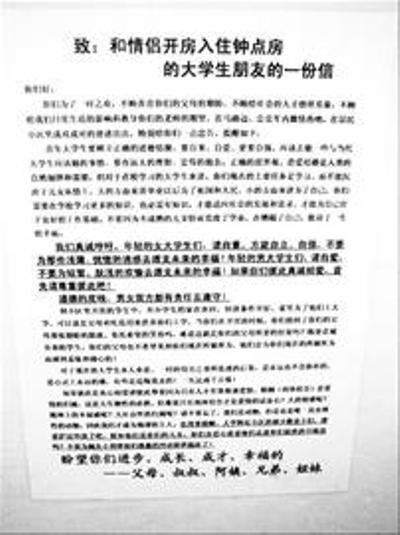 原公開(kāi)信就貼在南京仙林大學(xué)城文苑路某高檔小區(qū)門(mén)口,信中告誡大學(xué)生不要“為了一時(shí)之歡,不顧養(yǎng)你們的親人的期盼,不顧給社會(huì)人才的榜樣形象,不顧給我們?nèi)粘I畹挠绊懀诰用裥^(qū)內(nèi)成雙成對(duì)地進(jìn)出……”公開(kāi)信還提醒提供日租房的小區(qū)業(yè)主“不要為蠅頭小利替他們愚蠢的沖動(dòng)提供溫床了!”信件的落款是“盼望你們進(jìn)步、成長(zhǎng)、成才、幸福的父母、叔叔、阿姨、兄弟、姐妹!