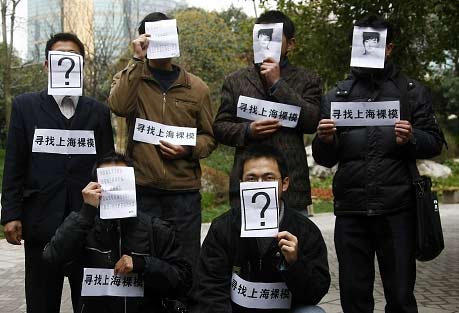 昨天上午,記者接到讀者報(bào)料趕到華山路、延安中路路口的天橋,遠(yuǎn)遠(yuǎn)就看見有7名男子身前貼著一張印有“尋找上海裸!弊謽拥募垙?jiān)跇蛎嫔弦蛔峙砰_,引來多名行人圍觀,旁邊還有兩名女性工作人員正在給行人介紹相關(guān)活動(dòng)內(nèi)容,由于天橋上行人不斷投來異樣的眼光,身貼字條的7名男子也不由自主地從站立改成了蹲姿。記者注意到,工作人員在向路人介紹時(shí)還提到了“為白血病人慈善募捐”。十幾分鐘后,圍觀的行人越來越多,引起了城管人員注意,隨后城管人員以影響交通為由將一行人請(qǐng)下了天橋,一行人下天橋后,直接走進(jìn)靜安公園內(nèi)!罢新隳U械浇诸^了,太夸張,先不說會(huì)不會(huì)真有人應(yīng)聘,但這種招聘行為很不文明。”市民陳先生說,更可氣的是對(duì)方竟把招裸模與慈善募捐聯(lián)系到一起,讓人費(fèi)解。記者隨后又采訪了數(shù)名經(jīng)過的路人,大家均表示策劃者此舉肯定是為了吸引眼球,并譴責(zé)這樣的行為影響社會(huì)風(fēng)氣。