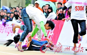 昨天下午,在東莞市新華南MALL就上演了一場別開生面的男生高跟鞋大賽,約400名男子集體穿著高跟鞋賽跑慶祝三八婦女節(jié)。盡管在情侶賽跑環(huán)節(jié)不少情侶都會驚險(xiǎn)地摔上一跤,不過他們?nèi)孕θ轁M面沖到終點(diǎn),然后再來一個(gè)深情的擁抱。