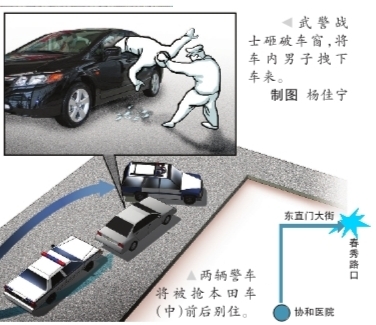 知情人透露,那輛本田車被搶后,該車司機立即撥打110報警,北京警方隨即向附近所有執(zhí)勤的民警、武警、警車發(fā)出圍堵命令,在全城范圍內堵截這輛黑色本田車。上午10點,一輛武警巡邏車和一輛110巡邏車按布控指令行駛到東直門內大街時,發(fā)現了正在瘋狂逃竄的本田車,兩輛巡邏車立即鳴響警笛一路追去,并最終將本田車別住,抓獲犯罪嫌疑人。