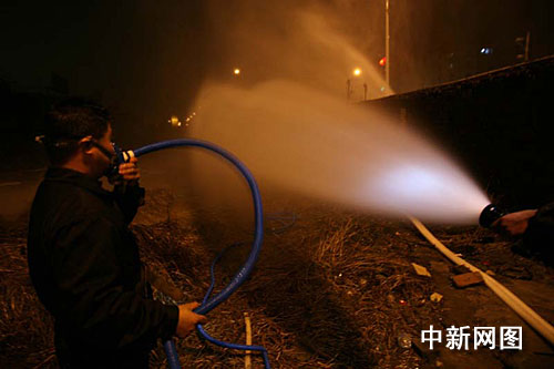 晚上七時許,記者趕到事故現(xiàn)場,空氣中彌漫著難聞的煤氣味。為防止意外,泄漏點江北大道前后500米已被交警部門拉起長長的警戒帶。由于封道,警戒線外汽車排起了長龍,一眼看不到底,圍觀者眾多,整條環(huán)城北路幾乎癱瘓,十幾名交警正在現(xiàn)場指揮疏散。而在警戒帶內(nèi)200米,消防部門正在下風方向設置了三道水幕水帶,對泄漏的煤氣進行稀釋。