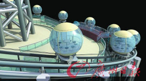 每個(gè)觀光球艙直徑3.2米,可“裝”4~6名乘客;球艙殼體采用新型高分子材料,晶瑩剔透,能保證艙內(nèi)游客對塔外景色一覽無余。