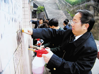 手拿刷子、噴水槍和抹布,公務(wù)纏身的書記、縣長親自動(dòng)手清除城市“牛皮癬”。3月13日,一網(wǎng)友在大渝網(wǎng)三峽吧發(fā)出的帖子《云陽書記縣長走上街頭清除“牛皮癬”何需親歷親為?》,引發(fā)網(wǎng)友熱議。有網(wǎng)友不解,書記和縣長何必在百忙之中對此“小事”親歷親為。從山東到云陽交流任職的云陽縣委書記李洪義昨日介紹說,云陽縣正在創(chuàng)建國家衛(wèi)生縣城,他希望通過自己的行為,號召大家一起關(guān)心城市環(huán)境。