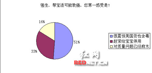 近日紅網(wǎng)一項(xiàng)得到近5000張投票的專題調(diào)查顯示,近51%的網(wǎng)友聽聞此事后感覺震驚,近97%的父母表示近期或今后將不再使用強(qiáng)生、幫寶適等美國(guó)品牌嬰兒衛(wèi)浴產(chǎn)品。如果含毒事件為真,64%左右的使用者會(huì)對(duì)這些產(chǎn)品提出控訴。
