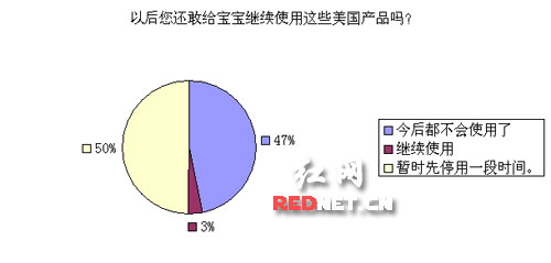 對(duì)于今后是否還會(huì)使用強(qiáng)生、幫寶適等產(chǎn)品,近47%的網(wǎng)友表示“以后都不會(huì)使用了,寶寶的生命要緊”,近50%的網(wǎng)友表示“持觀望態(tài)度,暫時(shí)停用一段時(shí)間”,兩者總和高達(dá)97%。僅剩下3%的網(wǎng)友明確表示,將繼續(xù)使用這些品牌的產(chǎn)品。(董雷)