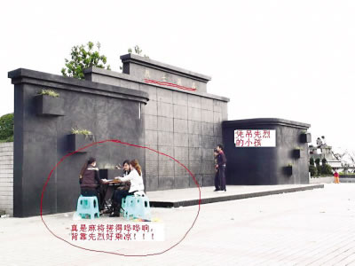 天涯網(wǎng)友“surperdry1”稱,15日那天,春光明媚,他帶上全家人到位于江津艾坪山的烈士陵園里面緬懷先烈。進(jìn)入陵園卻發(fā)現(xiàn)麻將聲聲,雞鳴不已,并配發(fā)大量照片以證實自己的話。此帖一出,立即引來網(wǎng)上熱議。烈士陵園怎能受到如此待遇?“surperdry1”還說,盡管草坪上有石碑警示路人“請您尊重安息在陵園內(nèi)的革命英烈,用文明的言行維護(hù)陵園的莊嚴(yán)肅穆”,但游人仍然我行我素。