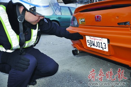 17日下午,煙臺(tái)市交警一大隊(duì)交警在南大街路段巡查時(shí),查住一輛雷人的老款本田轎跑車,該車車牌寫的全是外文。據(jù)駕駛員本人講,這副車牌是美國(guó)加利福尼亞州的車牌,他覺(jué)得洋車牌新鮮、氣派,便找別人弄到一副作廢的掛上了。交警表示,這種做法顯然是違法的,車主將面臨處罰。(記者 張琪 通訊員 趙亞林 溫全福 攝)